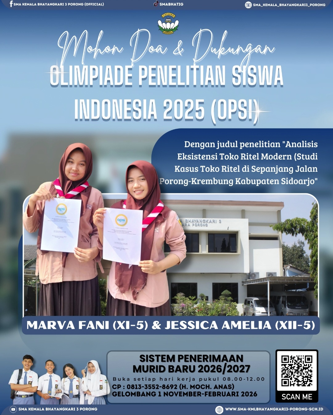 ![]() | Final OPSI 2025 Tim SMA Kemala Bhayangkari 3 Porong beranggotakan Jessica Amelia (XII-5) dan Marva Fani Aneira (XI-5), di bawah bimbingan Bapak Richi Ledi S.Pd. Kali ini mereka mengangkat eksistensi toko ritel Madura sebagai topik utama penelitian yang dikemas dalam karya tulis berjudul "Analisis Eksistensi Toko Ritel Madura terhadap Toko Ritel Modern (Studi Kasus Toko Ritel di Jalan Porong-Krembung)". |